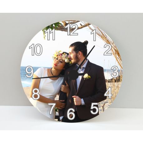 Horloge murale ronde à personnaliser. Analogique. 1 pile AA non incluse. Diamètre 29cm. Prix marquage texte et photo inclus.