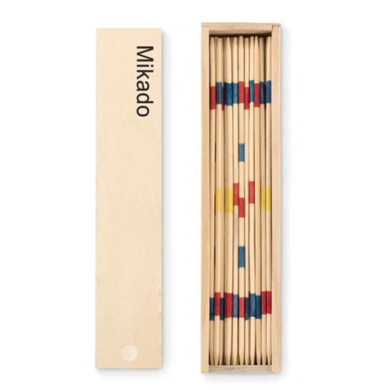 Jeu de MIKADO publicitaire à personnaliser. Livré dans une boîte en bois. Dimensions: 19,2 X 4,5 X 2,2 CM. Prix marquage compris 1 face, 1 couleur avec logo et texte.