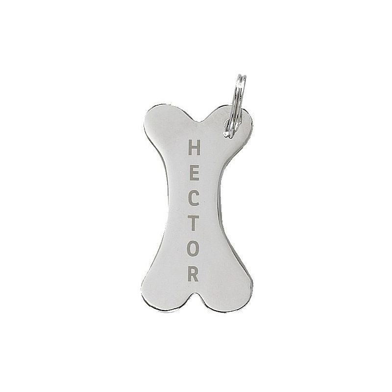 Médaille en laiton argenté ou doré. Forme os vertical. Livrée avec anneaux en acier. Plaque d'identité pour animaux. Gravure 2 lignes maximum. Police type Arial. Disponible en 35 ou 45 mm.