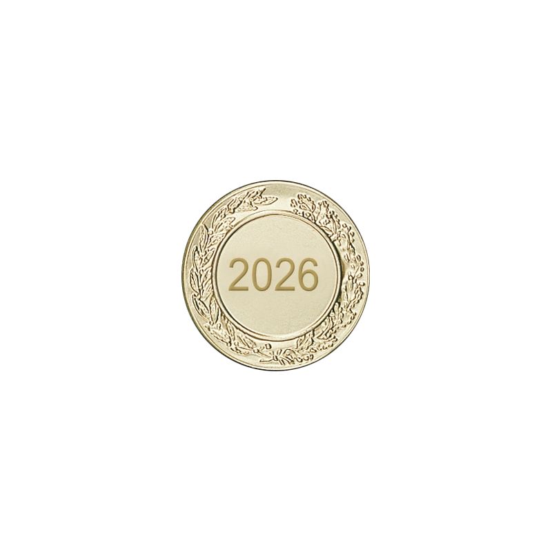 Pastille dorée pour Centre Médailles et Trophées. Motif Année 2026. Diamètre 25 ou 50mm.