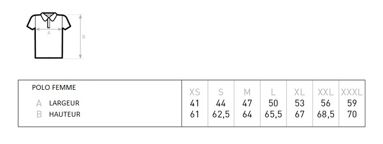 Le polo femme personnalisé, 100% coton, est disponible en 20 couleurs et 7 tailles différentes du XS au 3XL. Le polo classique, avec sa taille féminine et ajustée et sa patte de boutonnage 2 boutons ton sur ton, offre un un espace de communication tendance. Pour vous aider, un guide des tailles est consultable en ligne.
