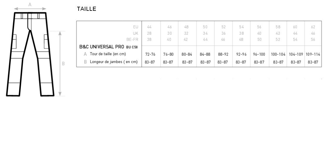 Pantalon professionnel résistant. 245g/m2. Anneau pour attaches. Poches ajustables. Ourlet élargi. 3 coloris au choix. Du 38 au 56. Prix marquage compris 1 face, 1 couleur.